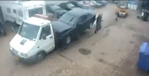 Lo gracioso es como el pobre operador del camión trata desesperadamente e instintivamente de evitar a pulso que el coche de una vuelta de campana cuando ya ha caído. Seguramente al conductor del coche le gustó como sonaba el motor del M3 (ya que lo está acelerando antes de mover el coche), pero se le olvidó que por nada del mundo hay que olvidarse (valga la redundancia) de que tenemos engranada la primera y un pie pisando el embrague. El desenlace, después del salto.