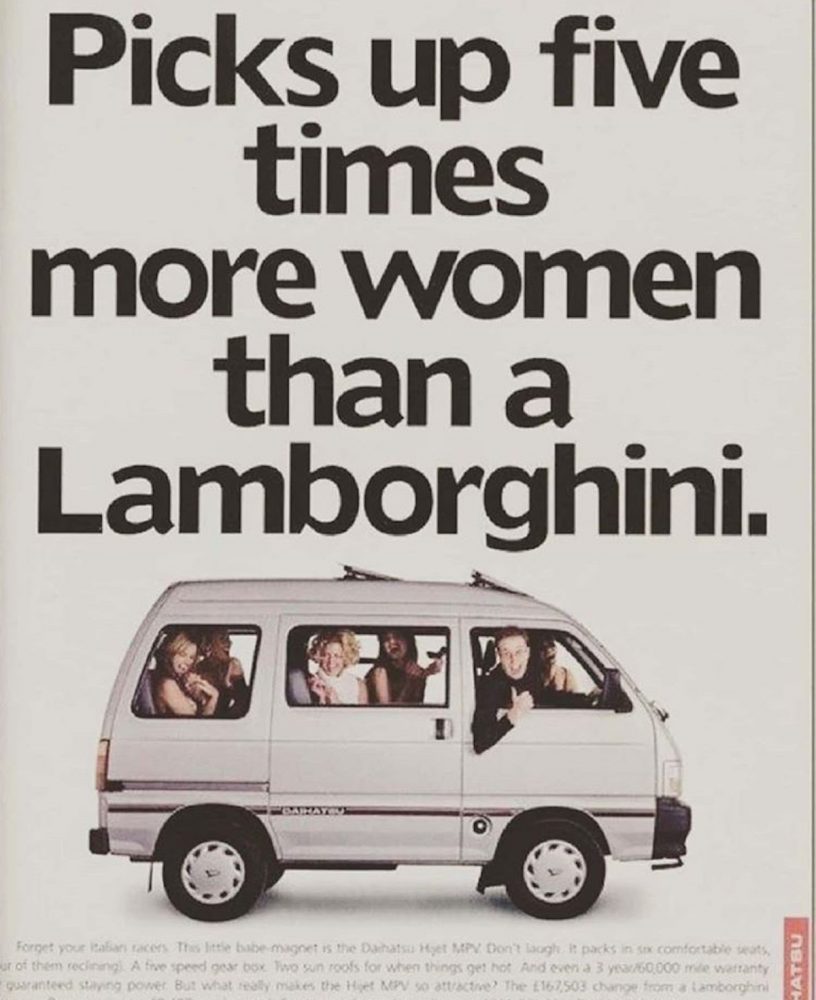«Atrae cinco veces más a las mujeres que un Lamborghini». Con este eslogan, Daihatsu pretendía hacer alusión a la capacidad del Hijet para albergar pasajeros, mientras que un Lamborghini Countach, por ejemplo, tan solo podía llevar a dos ocupantes. ¿Sexista? Puede, ¿original? Sin lugar a dudas.