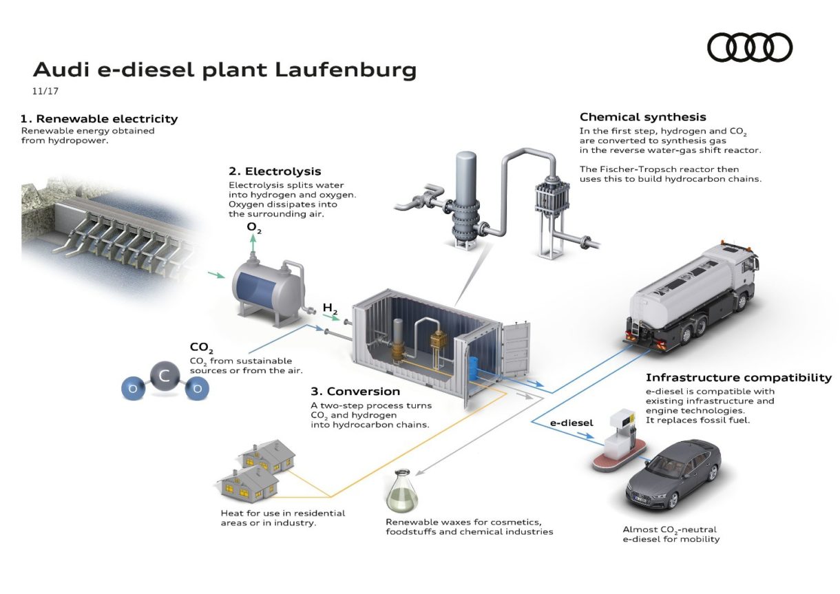 Esto supondrá que Audi se embarque en su segundo proyecto de planta piloto bajo el principio de electricidad a líquido «power-to-liquid», siendo la primera la planta de Dresden en la que trabajan desde 2014, de la que se encarga la corporación tecnológica Sunfire para producir e-diesel, siguiendo el mismo proceso pero con la implicación de diferentes tecnologías. Tampoco hay que olvidar la planta de Werlte en Alemania, en donde se produce el e-gas necesario para las variantes g-tron del A3 Sportback, A4 Avant y A5 Sportback, además de la fabricación de e-gasolina.
