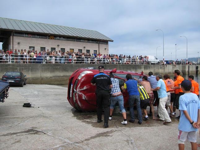 Tras este breve resumen de la noticia, cabe añadir que nosotros estábamos en el momento en el que el coche se hundía, junto con un nutrido grupo de personas en el Puerto de Baiona. Además del hundimiento del coche, también vimos todos la descoordinación de competencias que existe en nuestro país.