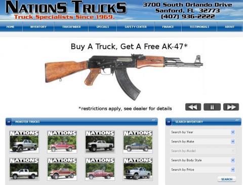 Curiosa noticia la que nos llega desde Estados Unidos en la que hoy podemos leer el gerente de Nations Trucks, empresa situada en Florida, ha decidido hacer realidad el sueño de muchos gracias a su última campaña publicitaria que literalmente anuncia: «¡Compre una camioneta y llévese un AK-47 gratis!«.