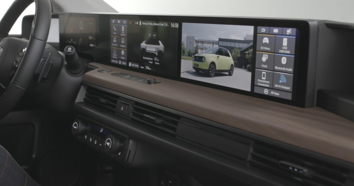 Para que resulte más fácil de manejar su estética está basada en la de los smartphones que estamos tan habituados a usar, aunque ambas pantallas estarán sincronizadas, permitiendo así pasar contenidos de una a otra en todo momento y teniendo siempre a mano lo que más necesitamos. Pero esto no quita para que ambas pantallas trabajen de manera independiente, pudiendo ofrecer distintos contenidos al conductor y al acompañante, por ejemplo, mientras el conductor tiene visible el navegador el acompañante puede seleccionar música o cualquier otra acción, ya que el Honda e dispone de conectividad a través de Apple CarPlay o Android Auto, incluso acceder a Internet a través de sus dispositivos gracias al punto de acceso WiFi que se incluye.