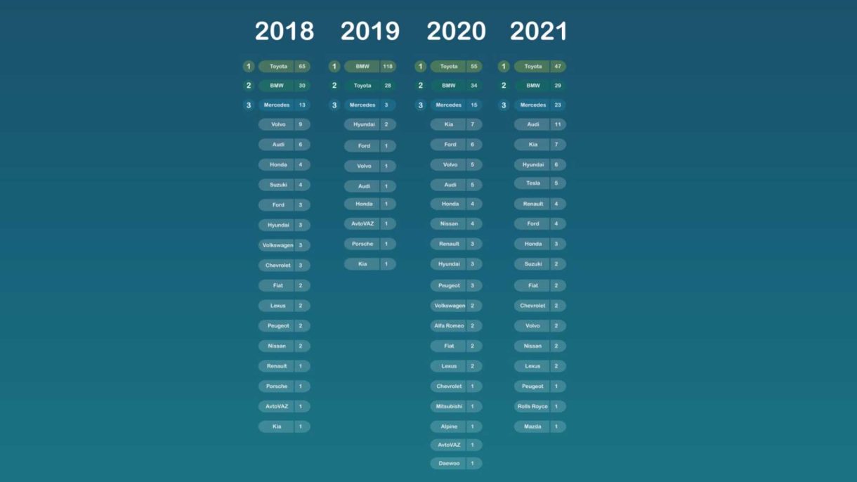 2021 ha sido el año de Toyota. Por segundo año consecutivo, la marca nipona se ha alzado como la marca de coches más buscada en Google. Se ha buscado en 47 de los 154 países representados. Esto representa el 31% del total. A su vez, BMW, también ocupa el segundo puesto, por segundo año consecutivo.