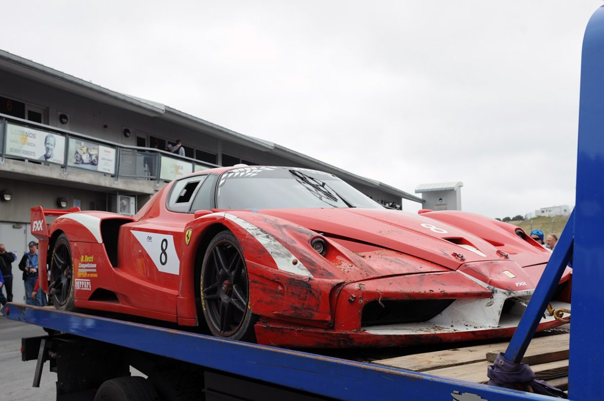 Pues bien, el problema ocurrió, tal y como puedes ver en las imágenes con uno de los tres Ferrari FXX que en ese momento se encontraban rodando que al parecer habría sufrido los efectos del mítico sacacorchos donde ciertos pilotos se han hecho grandes y otros han estrellado sus monturas.