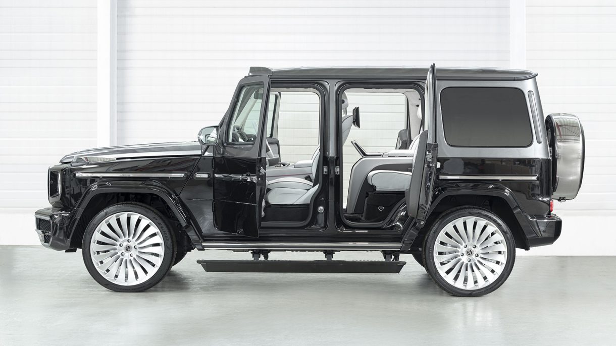 Una de las principales características de esta personalización es la incorporación de puertas suicidas en la parte trasera del coche. Estas puertas se abren desde atrás, con las bisagras en la parte posterior. Es un tipo de puerta que se conoce por su uso en coches de superlujo como los Rolls Royce y que aporta al Mercedes Clase G una imagen más atractiva.