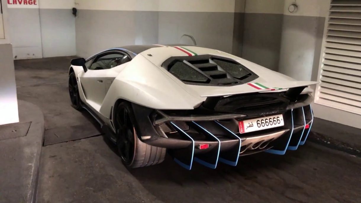 Se cree que el coche pertenece al jeque qatari Khalifa bin Hamad Al Thani, un tipo con buen gusto a la hora de elegir color de carrocería para un superdeportivo. Su Lamborghini Centenario incorpora una tonalidad blanco mate en su monocasco que contrasta con el negro mate del difusor, el techo, los faldones laterales y el parachoques trasero. Adicionalmente, el coche introduce una franja con los colores de la bandera italiana así como diferentes acentos en azul brillante; dos elementos que aportan una gran deportividad visual. Las llantas de color negro mate completan la lista de elementos personalizados de este vehículo.