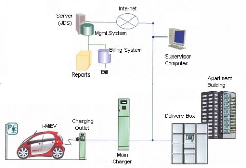 Mitsubishi, en colaboración con Japan Delivery System Corporation, han desarrollado un sistema de recarga para coches eléctricos, para ser instalado en edificios de departamentos, los cuales, no tienen las mismas comodidades que una casa con garage para recargas el coche.