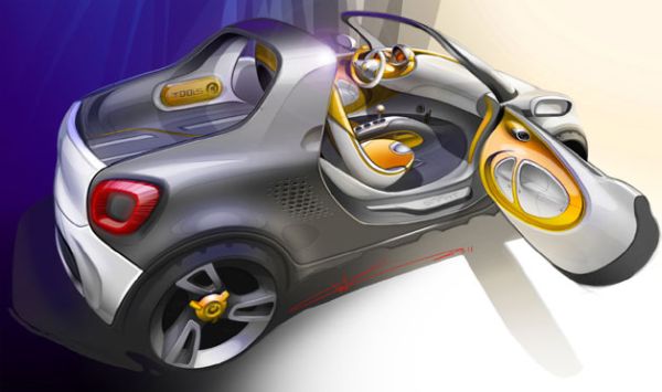 Los interiores del bocetos tienen un aire futurista y moderno, aunque básicamente son similares al que conocemos del Smart ForTwo o a los del Smart ForVision, si bien con otra combinación de colores. La novedad del smartphone haciendo las veces de espejo retrovisor es un detalle más geek para el Smart ForUs, aunque la verdad es que su imagen despreocupada y un smartphone de retrovisor, no creo que ayude demasiado a las ventas de los demás modelos de Smart en Norteamérica.