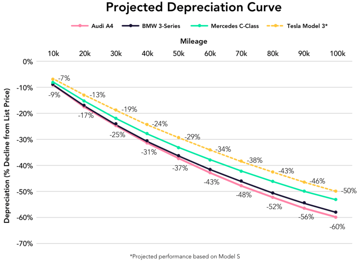 Según las declaraciones de Alex Klein, vicepresidente de datos científicos de Autolist, en referencia a la depreciación del Model 3 ha afirmado que «usando como referencia los datos del Model S y el precio de los competidores del Model 3, nuestro pronóstico proyecta una curva de depreciación que sitúa al Model 3 en lo más alto. El vehículo sólo perdería el 29% de su valor después de 80.000 km y el 50% tras recorrer 160.000 km«.