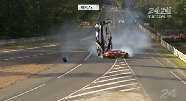 Ambos vehículos se fueron directamente a la barrera de neumáticos, pero mientras el Ferrari llegaba por el suelo derrapando, el Toyota lo hacía por los aires a la vez que daba vueltas. Tras el brutal accidente, ambos pilotos fueron llevados rapidamente al hospital mientras salía el Safety Car en la carrera.